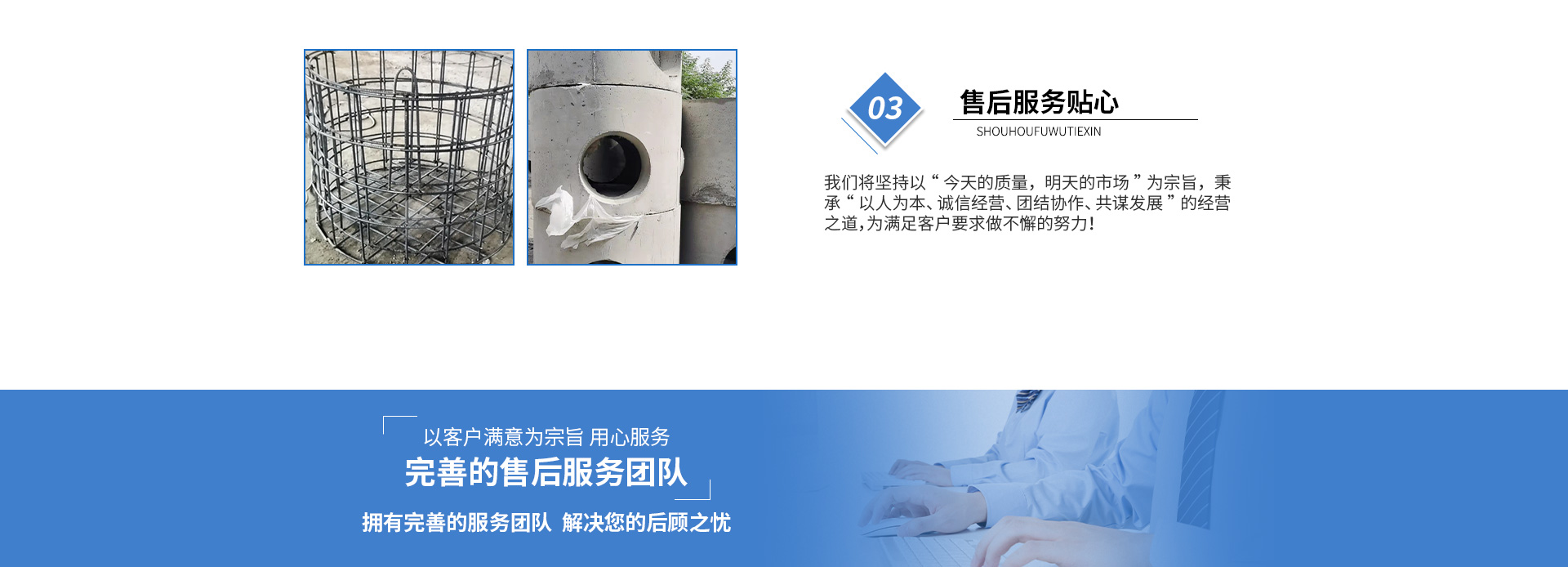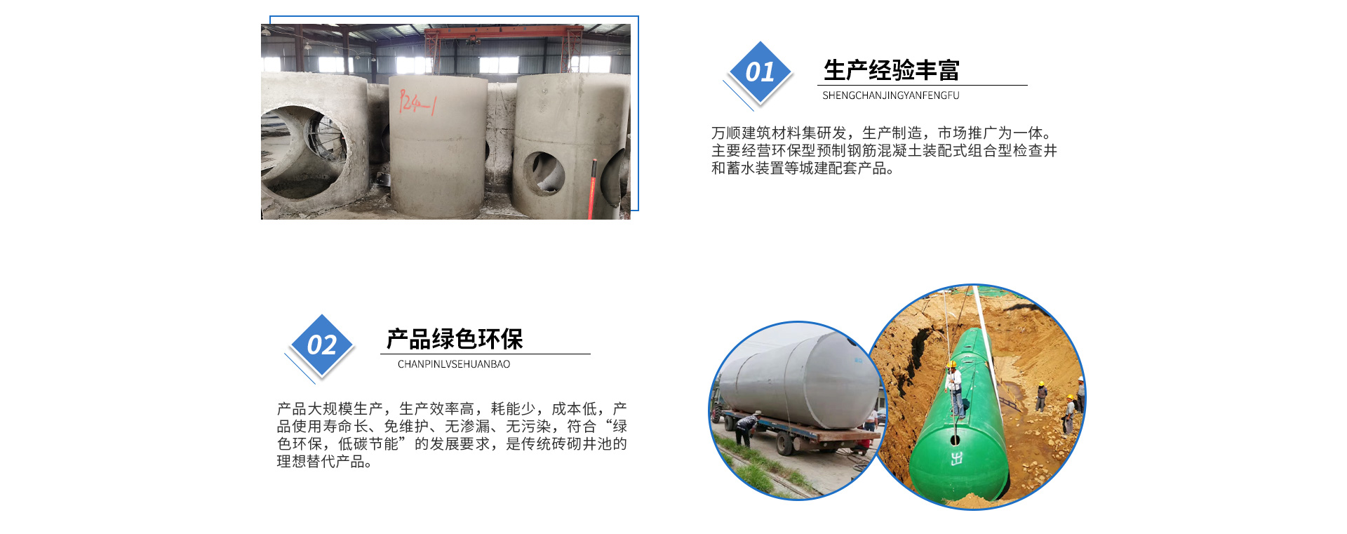 黃山市萬順建筑科技有限公司是集研發(fā),生產(chǎn)制造,市場(chǎng)推廣為一體的綜合性企業(yè)。公司主要經(jīng)營(yíng)環(huán)保型預(yù)制鋼筋混凝土裝配式組合型檢查井和蓄水裝置等城建配套產(chǎn)品。產(chǎn)品生產(chǎn)過程采用獨(dú)特的生產(chǎn)工藝,機(jī)械化流水作業(yè)。產(chǎn)品大規(guī)模生產(chǎn),生產(chǎn)效率高,耗能少,成本低,產(chǎn)品使用壽命長(zhǎng)、免維護(hù)、無滲漏、無污染,符合“綠色環(huán)保,低碳節(jié)能”的發(fā)展要求,是傳統(tǒng)磚砌井池的理想替代產(chǎn)品。
